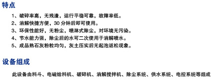 装载机将生石灰装入料斗中,通过定量给料机进入破碎机,破碎后的生石灰落入消解机内,同时用于除尘后的二次水由供水装置在消解机内均匀喷洒,通过消解机的搅拌、挤压、相向、背向等力的作用下,消解后的熟石灰落入储料池待用。